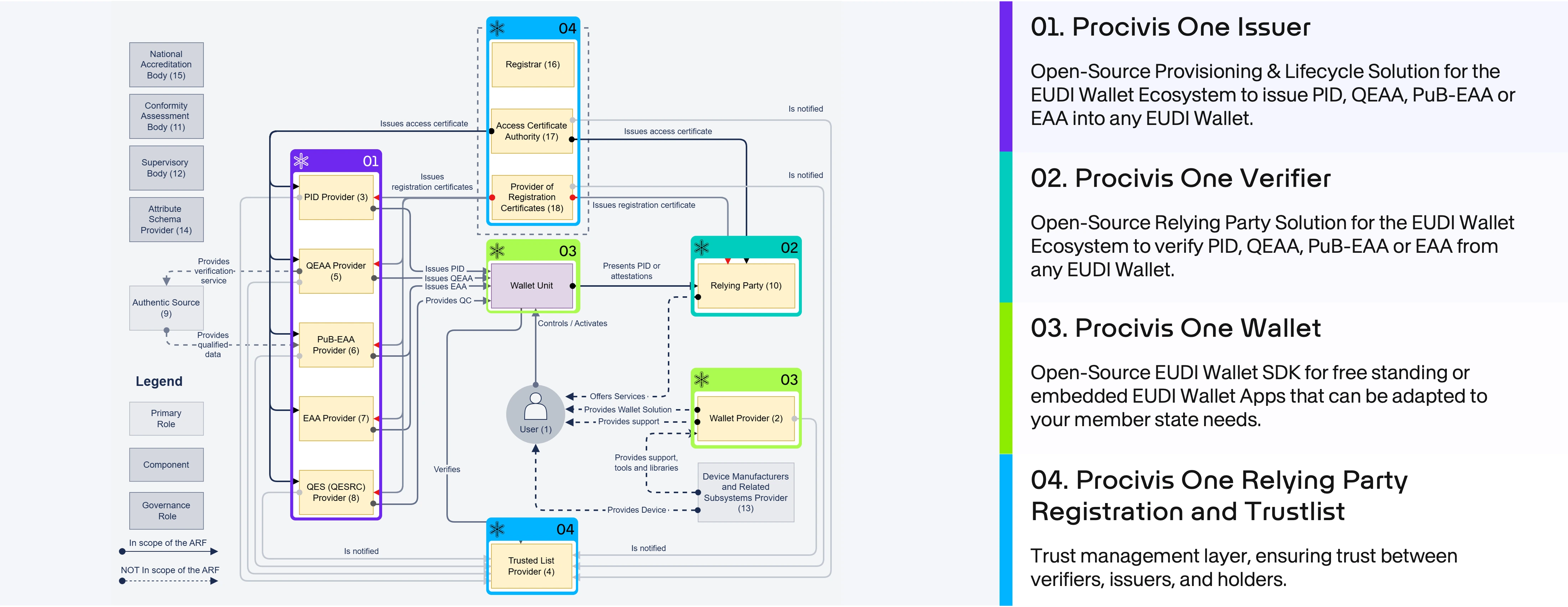 - Integrated Wallet Provider: Procivis One provides full Wallet Provider functionality, including the secure issuance and management of both WIA and WUA for its wallets